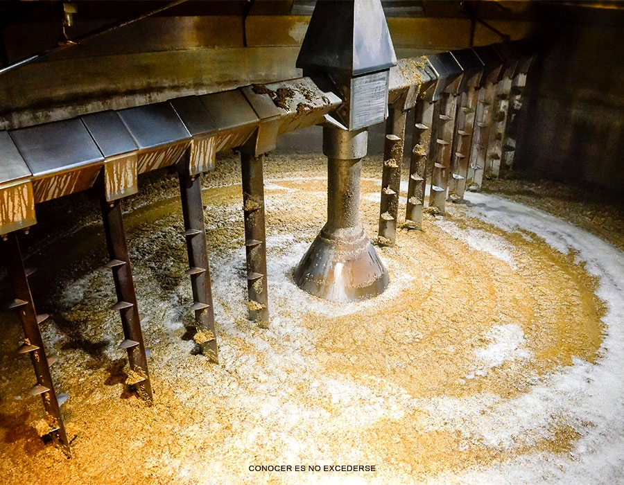 La malta seca se muele hasta convertirse en “grist”, una especie de harina gruesa que se mezcla con agua caliente en tinas de maceración. Esta combinación activa enzimas que liberan los azúcares solubles necesarios para la fermentación.